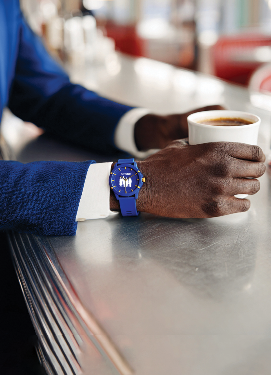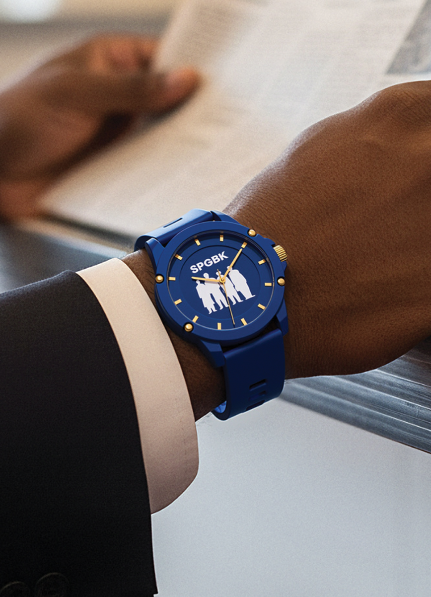 Inspired by the nostalgia of campus camaraderie and the bonds that last far beyond graduation, this limited-edition watch features bold blue and gold tones accented with a white “Feb. 1” outline on the dial, symbolizing strength, legacy, and pride. The signature SPGBK logo ties it all together as a mark of heritage and creativity.
